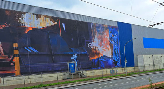 Die Logistikhalle gegenüber Logport 2 in Duisburg-Wanheim, direkt unterhalb der Landmarke „Tiger & Turtle", ist seit dieser Woche auch eine Freiluftgalerie: An den Außenwänden der 200 Meter langen Halle hängen dauerhaft zwei farbenfrohe, großformatige Kunstdrucke, die szenisch Motive aus der Stahlproduktion aufgreifen — kombiniert mit manch überraschenden Details.